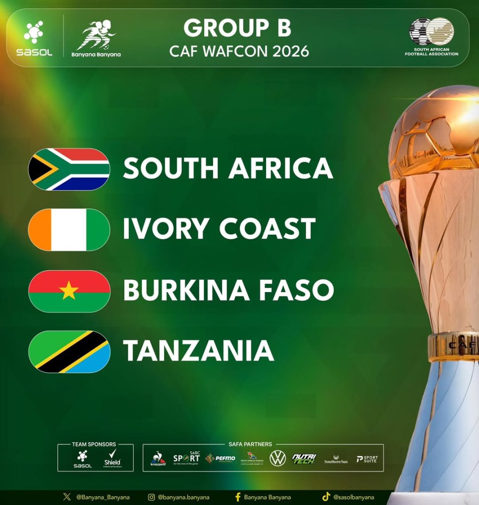 South Africa has been drawn in Group B against Burkina Faso, Ivory Coast and Tanzania.