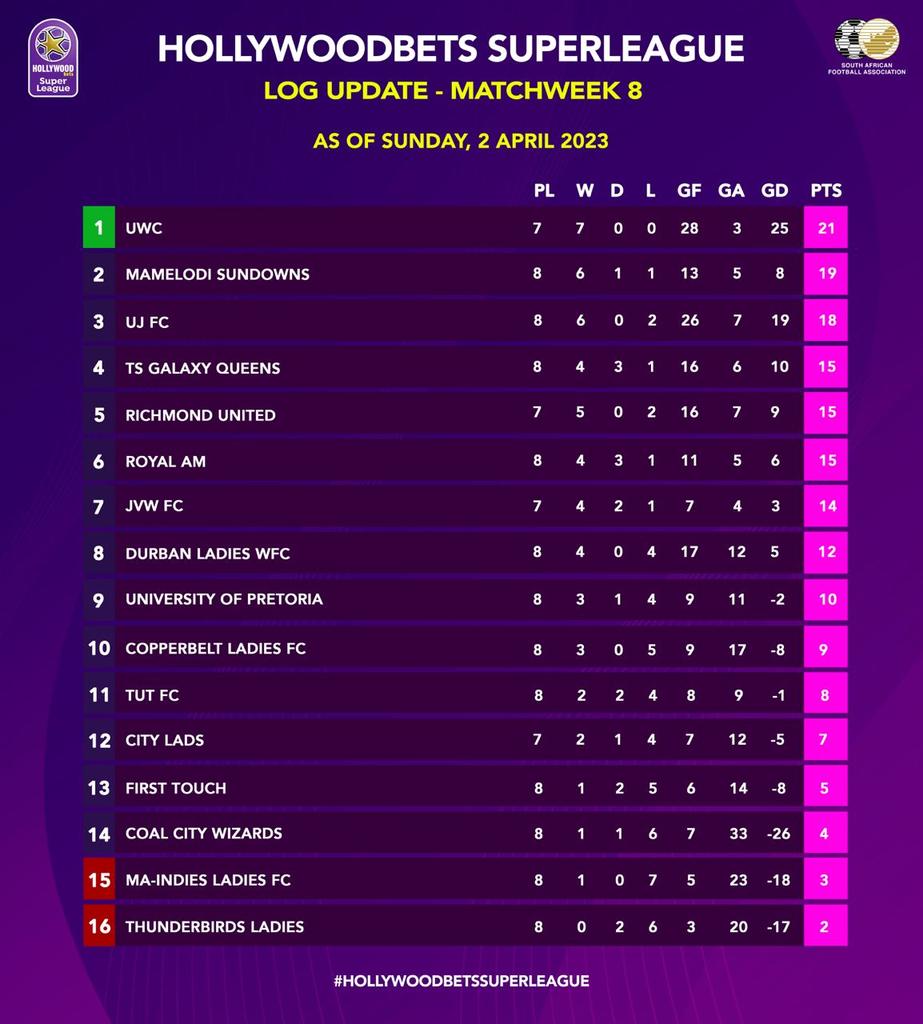 - Four teams have lost only one match each: Sundowns Ladies, TS Galaxy Queens, Royal AM, JVW